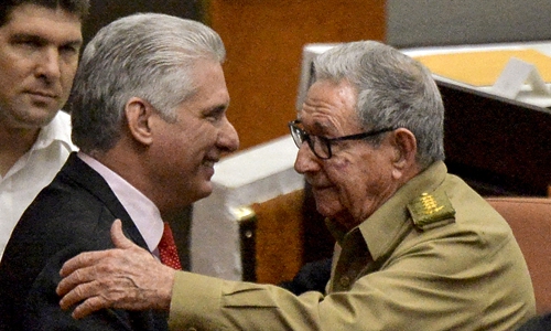 Cuban First Secretary of the Communist Party Raul Castro (right) greets Cuban President Miguel Diaz Canel during the closing of the Fourth Regular Session of the National Assembly of People's Power in its Ninth Legislature at the Havana Convention Center on Saturday. The National Assembly of Cuba appointed architect Manuel Marrero prime minister on Saturday, the state press reported. Photo: AFP