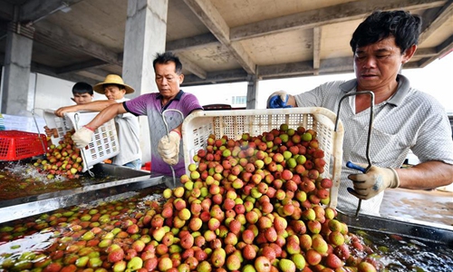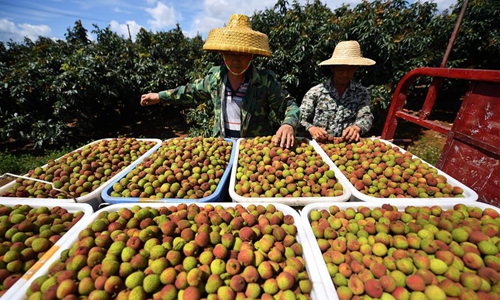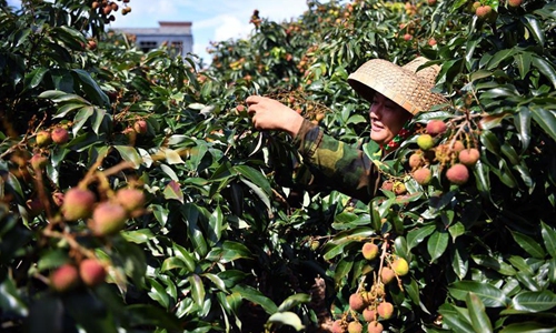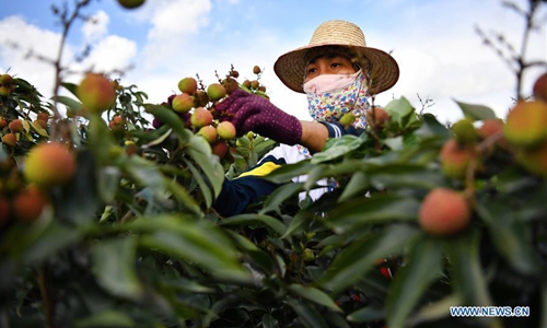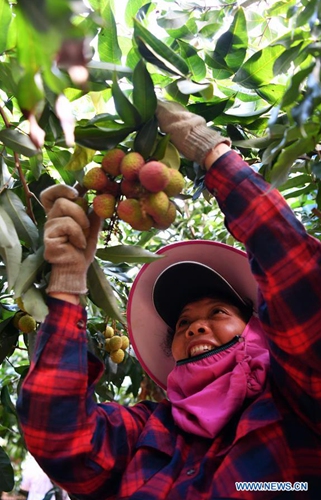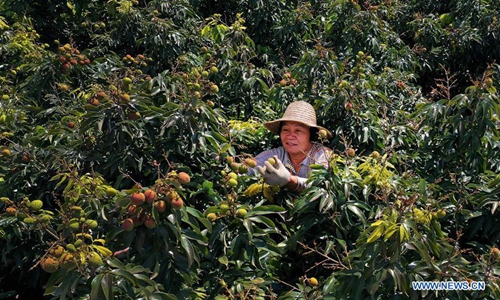A farmer picks litchi at Sanmenpo Town in Qiongshan District of Haikou City, south China's Hainan Province, May 14, 2020. Harvest season for litchi has come in northern Hainan. (Xinhua/Guo Cheng)