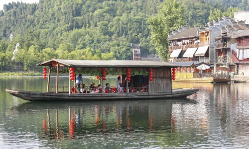 Tourists take a boat near the Hong'an ancient town in Xiushan County, southwest China's Chongqing Municipality, May 16, 2020. (Photo by Huang Wei/Xinhua)
