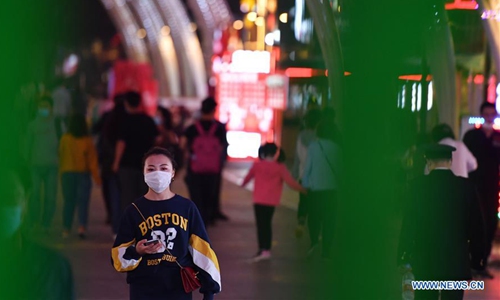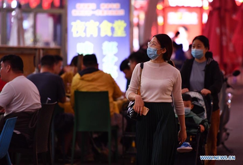 People walk on a street at Aocheng Night Fair in Nankai District of Tianjin, north China, May 16, 2020. Many merchants at the night fair gradually extend their operating hours and enrich their products, helping Tianjin's night economy recover further. (Xinhua/Li Ran)