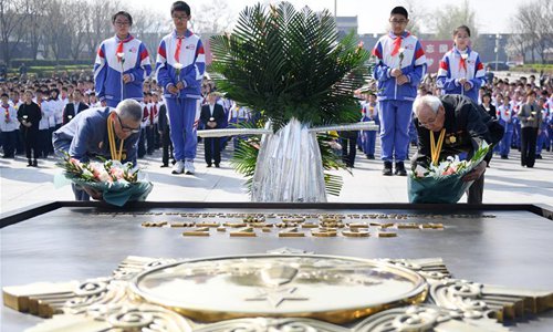People lay flowers to pay tribute to revolutionary martyrs during a campaign at the Museum of the War of Chinese People's Resistance Against Japanese Aggression in Beijing, capital of China, April 4, 2019. China has kicked off a campaign to promote paying tribute to revolutionary martyrs as Tomb-sweeping Day draws near. The campaign is aimed at combining educational activities with paying tribute. Tomb-sweeping Day, also known as Qingming Festival, falls on April 5 this year. It is a traditional Chinese holiday where people pay tribute to deceased family and friends. (Photo: Xinhua)