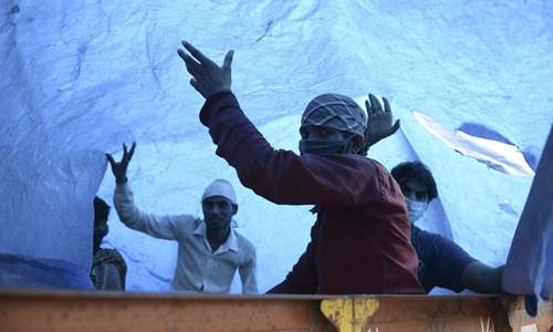 Migrant workers hold a plastic sheet to protect themselves from the rain inside a truck as they return to their hometowns after the government eased a nationwide lockdown as a preventive measure against COVID-19 on the outskirts of Hyderabad, India on Saturday. Photo: AFP
