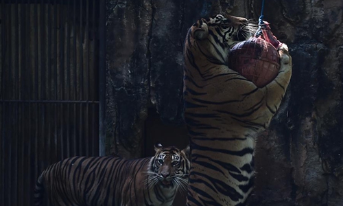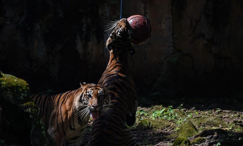 A Sumatran tiger plays with a ball during an Instagram Live program in Ragunan Zoo amid the COVID-19 outbreak in Jakarta, Indonesia, May 17, 2020. Ragunan Zoo management has prepared the Instagram Live program since the zoo is closed to the public amid the COVID-19 outbreak. (Xinhua/Agung Kuncahya B.)