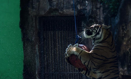 A Sumatran tiger tries to reach a piece of meat during an Instagram Live program in Ragunan Zoo amid the COVID-19 outbreak in Jakarta, Indonesia, May 17, 2020. Ragunan Zoo management has prepared the Instagram Live program since the zoo is closed to the public amid the COVID-19 outbreak. (Xinhua/Agung Kuncahya B.)
