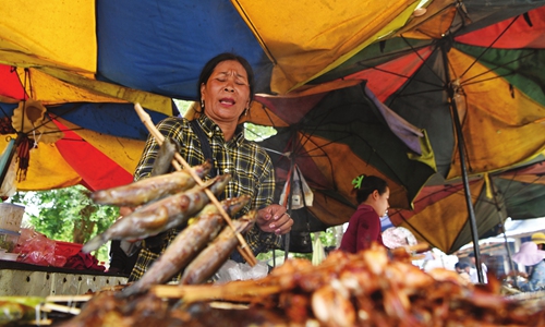 A food vendor grills fish for customers at a stall by Phnom Tamao zoo in Takeo Province, Cambodia on Sunday, amid the easing of restrictions to revive an economy hit by COVID-19. Residents gradually return to their usual routines as no new infections have been recorded since mid-April. Photo: AFP