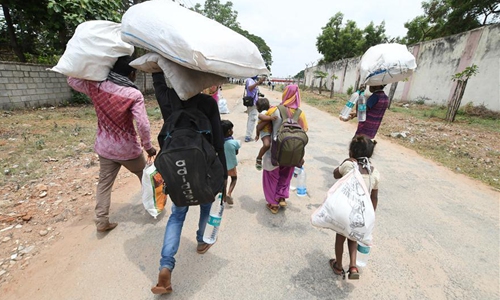 Migrant workers carry luggage as they leave for their hometown during the coronavirus lockdown from Bangalore, India, May 16, 2020.Photo:Xinhua