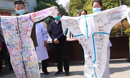 In a press release on Monday, the administration said that PPE gear used by frontline medical staff, silk banners used by medical rescue teams in Jinyintan Hospital in Wuhan, Central China's Hubei Province and East China's Jiangsu Province, and paintings and calligraphy works from some Chinese artists were donated to the Nanjing Museum's collection.