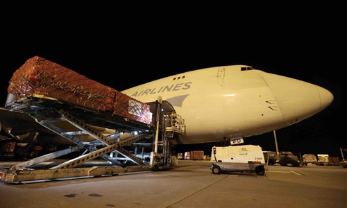 Chinese medical supplies on COVID-19 for Europe are unloaded at the airport of Liege in Belgium, on March 13, 2020. A plane carrying Chinese medical supplies for Europe, including face masks and testing kits on COVID-19, landed on Friday night.Photo: Xinhua