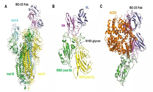 (A&B) Cryo-EM structure of BD-23 Fab in complex with the Spike-ectodomain trimer (C) RBD/ACE2 complex structure overlays with RBD/ BD-23 Fab structure, which demonstrates BD-23 Fab can block S protein binding with ACE2.
