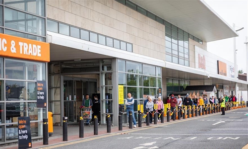People queue up outside a homeware store in Dublin, Ireland, May 18, 2020. Ireland on Monday entered into what it called Phase-One stage in easing the restrictions which were imposed some 50 days ago following the COVID-19 outbreak in the country. During the stage, more businesses are allowed to be reopened in the country. They include hardware stores, homeware shops, garden centers, farmers' markets, repair shops for cars, motorbikes and bicycles, and optical shops. Restaurants like McDonald's and Burger King are also permitted to provide drive-through services. (Xinhua)