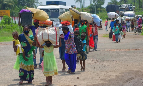 Stranded people walk towards the railway station to board a train to their states amid the ongoing COVID-19 lockdown on the outskirts of Agartala, the capital city of India's northeastern state of Tripura, May 17, 2020. (Str/Xinhua)