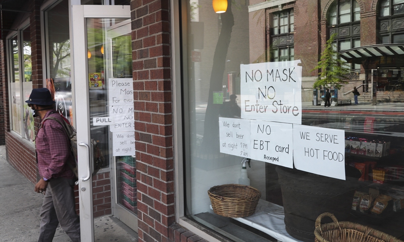 A store in New York, US, puts up a notice which reads "No Mask, No Entry" on Monday. According to data from the John Hopkins University, as of press time on Tuesday, the US has reported more than 1,508,900 confirmed cases of COVID-19, the largest number in the world with the death toll at more than 90,000. Photo: AFP