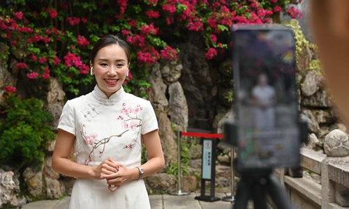 Staff members perform via livestreaming on a cellphone at a historical and cultural area of Fuzhou, southeast China's Fujian Province, May 19, 2020. May 19 marks the China Tourism Day. Local authorities in Fuzhou conduct livestreaming via cellphones to enable people eleswhere to have a chance to taste the local cultures. (Xinhua/Lin Shanchuan)
