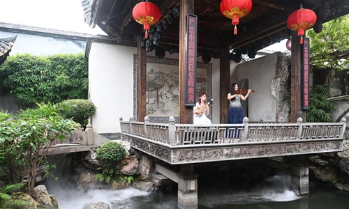Aerial photo taken on May 19, 2020 shows staff members performing via livestreaming on a cellphone at a historical and cultural area of Fuzhou, southeast China's Fujian Province. May 19 marks the China Tourism Day. Local authorities in Fuzhou conduct livestreaming via cellphones to enable people eleswhere to have a chance to taste the local cultures. (Xinhua/Lin Shanchuan)