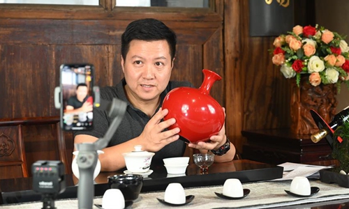 A staff member introduces local lacquerware culture at a historical and cultural area of Fuzhou, southeast China's Fujian Province, May 19, 2020. May 19 marks the China Tourism Day. Local authorities in Fuzhou conduct livestreaming via cellphones to enable people eleswhere to have a chance to taste the local cultures. (Xinhua/Lin Shanchuan)