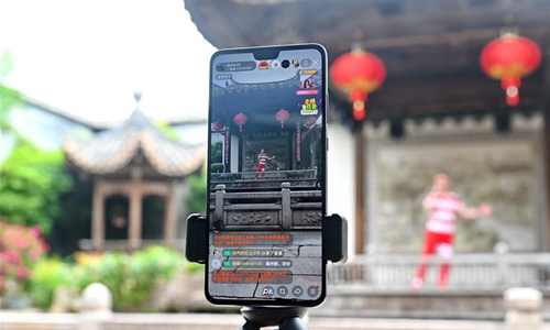 A staff member performs via livestreaming on a cellphone at a historical and cultural area of Fuzhou, southeast China's Fujian Province, May 19, 2020. May 19 marks the China Tourism Day. Local authorities in Fuzhou conduct livestreaming via cellphones to enable people eleswhere to have a chance to taste the local cultures. (Xinhua/Lin Shanchuan)