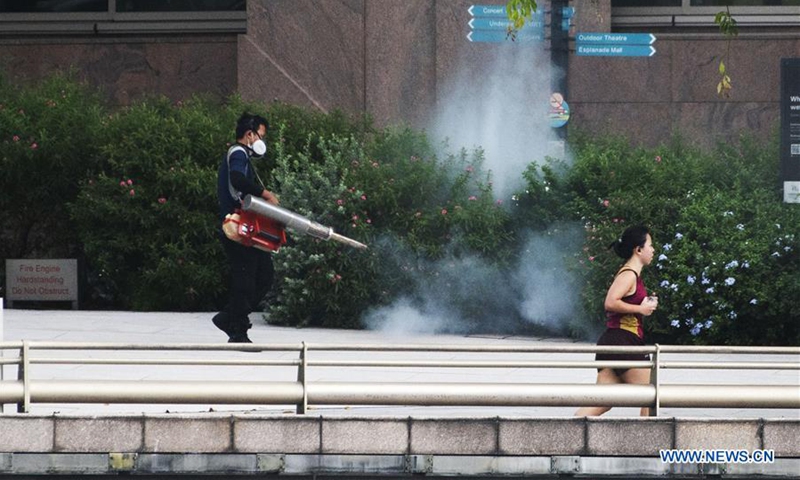 A worker sprays pesticide as part of the fight against dengue fever outside the Esplanade arts center in Singapore on May 20, 2020. (Photo by Then Chih Wey/Xinhua)