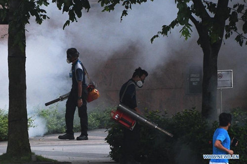 Workers spray pesticide as part of the fight against dengue fever outside the Esplanade arts center in Singapore on May 20, 2020. (Photo by Then Chih Wey/Xinhua)
