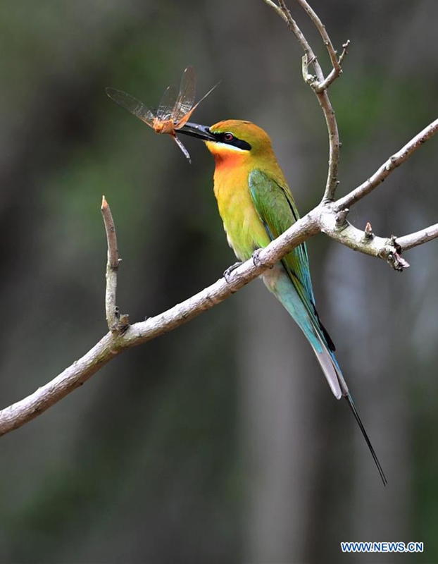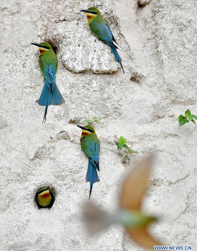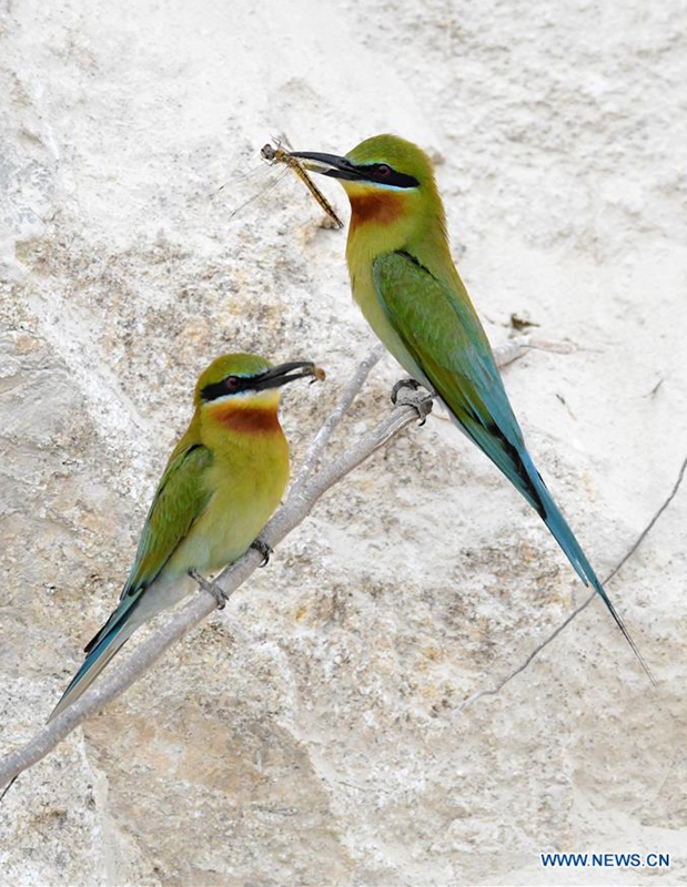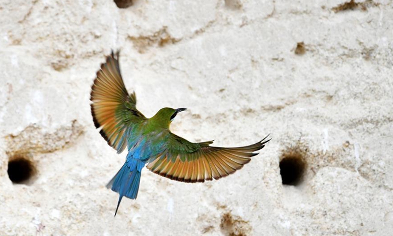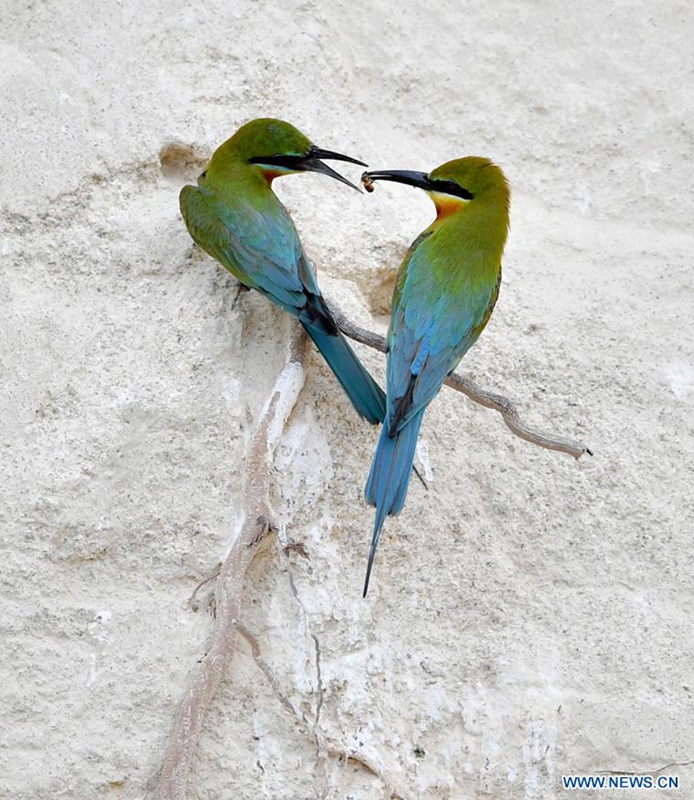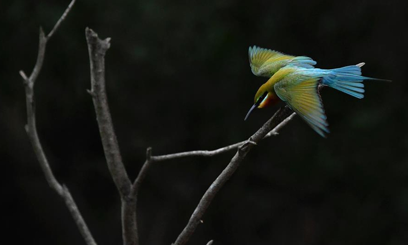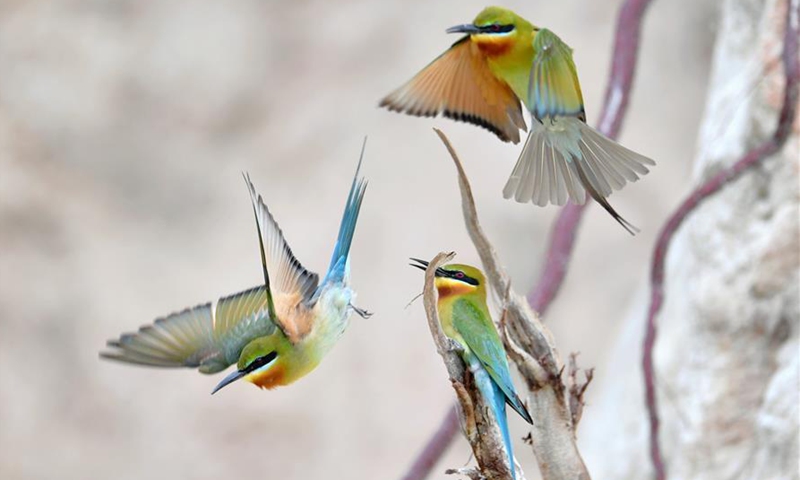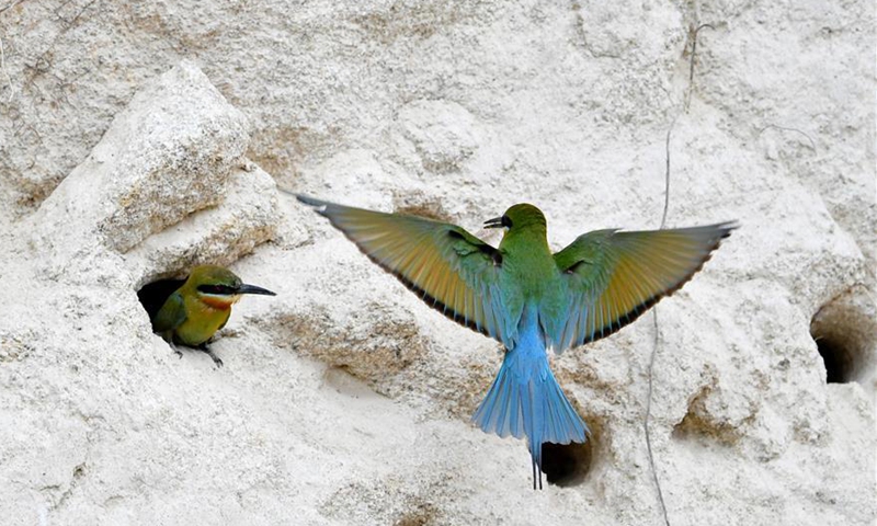 Blue-tailed bee eaters are seen at Wuyuanwan blue-tailed bee eater nature reserve in Xiamen, southeast China's Fujian Province, May 19, 2020. Photo:Xinhua