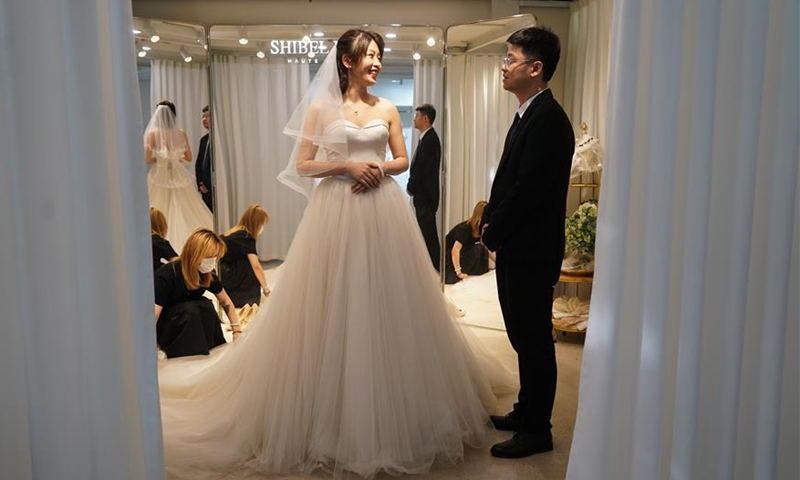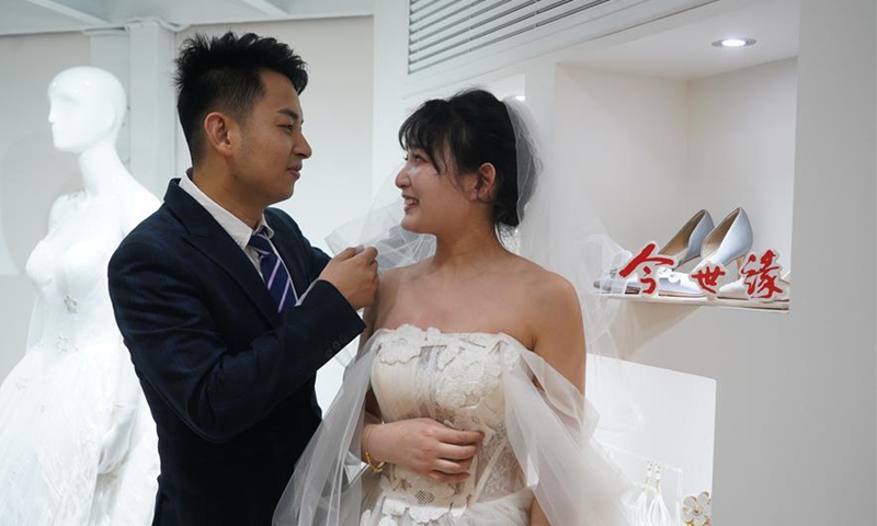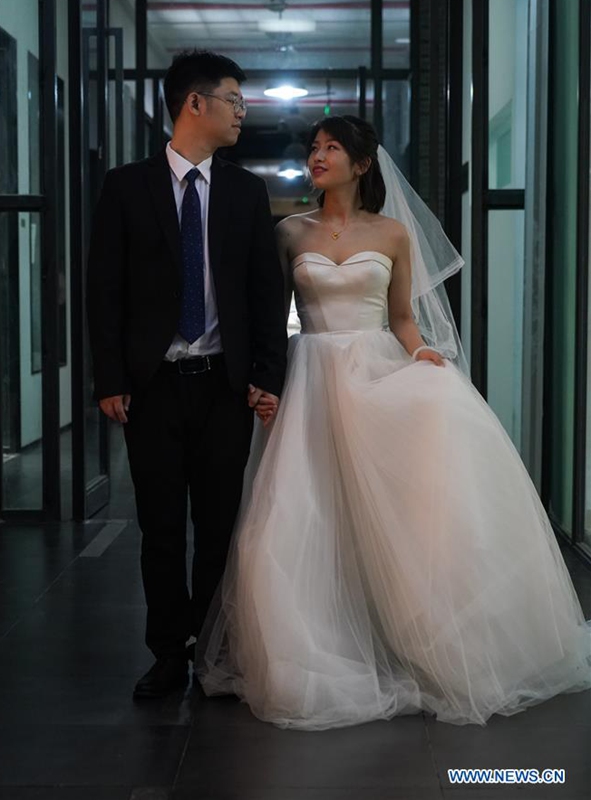 Wang Weiwei (C) tries a wedding dress in Nanjing, east China's Jiangsu Province, May 19, 2020. Wang is a doctor of ICU department of Jiangsu Province Hospital, and has been in Wuhan to aid the coronavirus control efforts for 45 days. A total of 15 couples took wedding photos in Nanjing on Tuesday ahead of their group wedding ceremony on May 20. Some of the newly-weds are medical workers who have postponed their weddings due to their participations in the fight against the COVID-19 pandemic.Photo:Xinhua