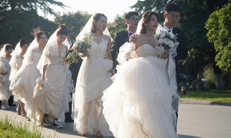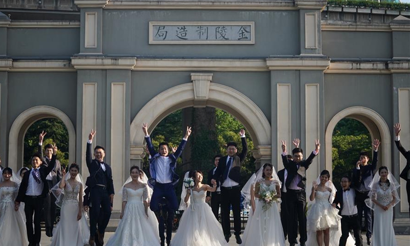 Couples pose for a group photo in Nanjing, east China's Jiangsu Province, May 19, 2020. A total of 15 couples took wedding photos in Nanjing on Tuesday ahead of their group wedding ceremony on May 20. Some of the newly-weds are medical workers who have postponed their weddings due to their participations in the fight against the COVID-19 pandemic.Photo:Xinhua