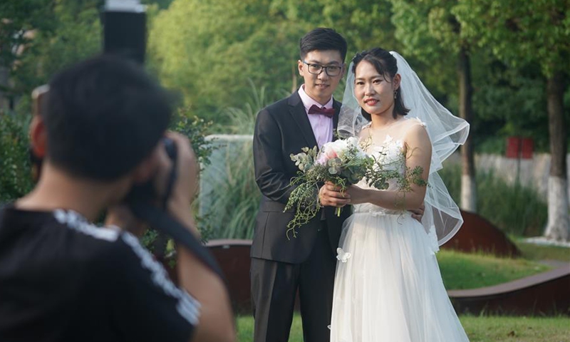Wang Weiwei (R) takes wedding photos with Zhou Sijia in Nanjing, east China's Jiangsu Province, May 19, 2020. Wang is a doctor of ICU department of Jiangsu Province Hospital, and has been in Wuhan to aid the coronavirus control efforts for 45 days. A total of 15 couples took wedding photos in Nanjing on Tuesday ahead of their group wedding ceremony on May 20. Some of the newly-weds are medical workers who have postponed their weddings due to their participations in the fight against the COVID-19 pandemic.Photo:Xinhua