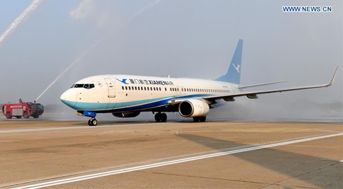 Flight MF8095 of the Xiamen Airlines is welcomed at the Tianhe Airport in Wuhan, capital of central China's Hubei Province, April 8, 2020. Flight MF8095 from Hangzhou, capital of east China's Zhejiang Province, was the first flight arriving in Wuhan after it lifted outbound travel restrictions on Wednesday. (Xinhua/Cheng Min)