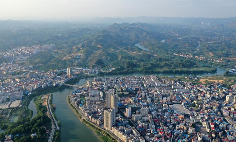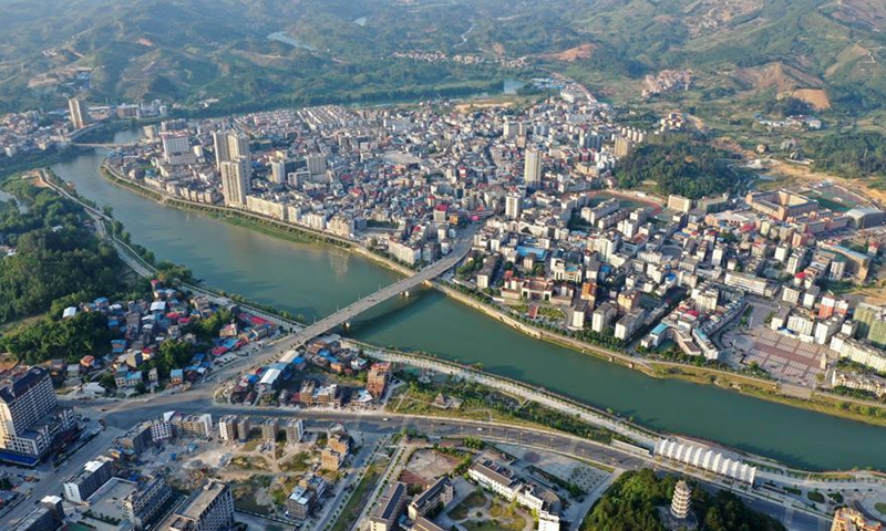 Aerial photo taken on May 14, 2020 shows a view of the county seat of Huanjiang Maonan Autonomous County, south China's Guangxi Zhuang Autonomous Region. The Maonan ethnic group is one of China's 28 ethnic groups with a smaller population. About 70 percent of Maonan people, or 64,500, live in Huanjiang County, south China's Guangxi Zhuang Autonomous Region. The poverty headcount ratio in Huanjiang dropped to 1.48 percent by the end of 2019. In May of 2020, the county was removed from the country's list of impoverished counties. Based on the Maonan people's poverty alleviation situation across the country, the ethnic group has gotten rid of poverty as a whole. (Xinhua/Lu Boan)