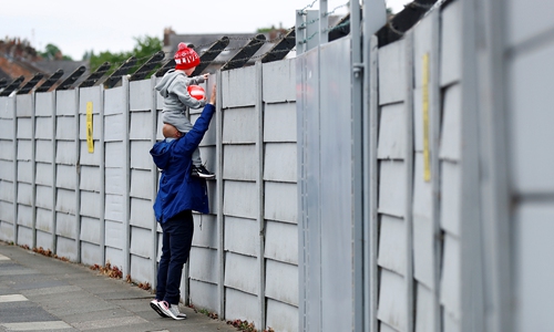 A father holds up his son to look over the fence at Melwood training ground in Liverpool, England as Liverpool players resume training on Tuesday. Photo: VCG