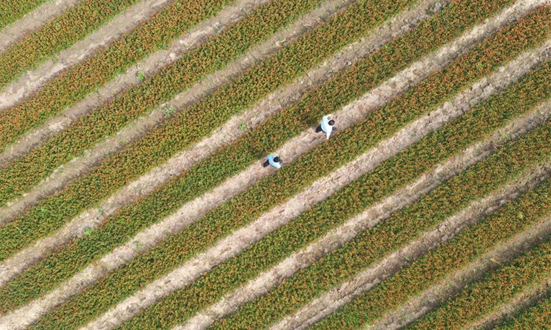 Aerial photo taken on May 20, 2020 shows people walking among a nursery in Wancheng District of Nanyang City, central China's Henan Province. Local authorities have been promoting characteristic nursery industry in recent years to facilitate the increase of farmers' incomes.Photo:Xinhua