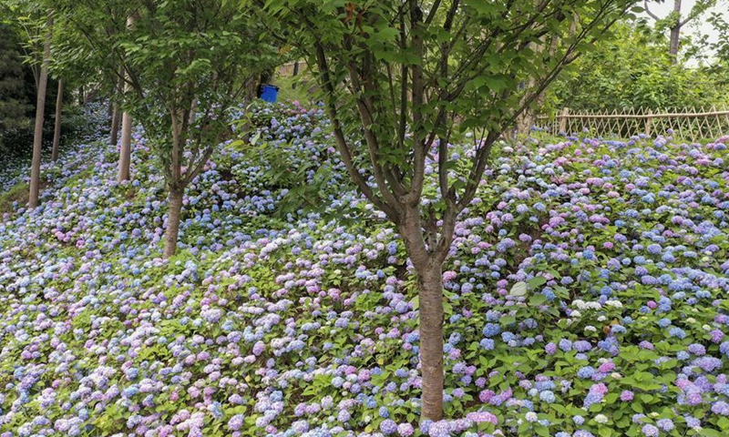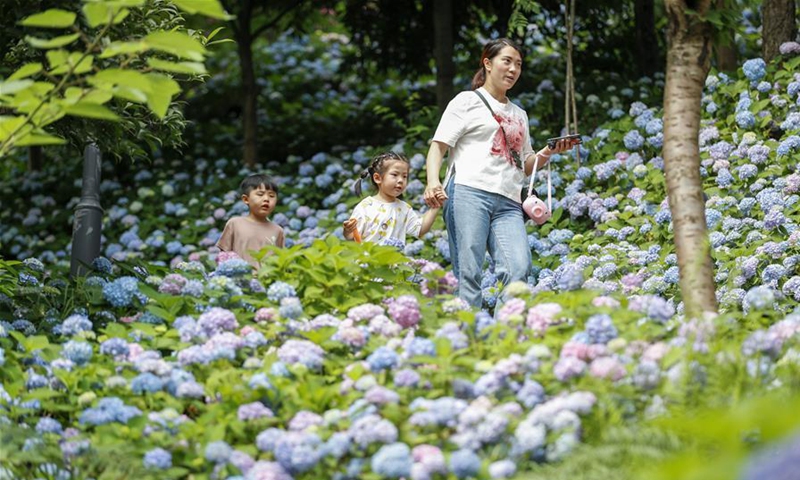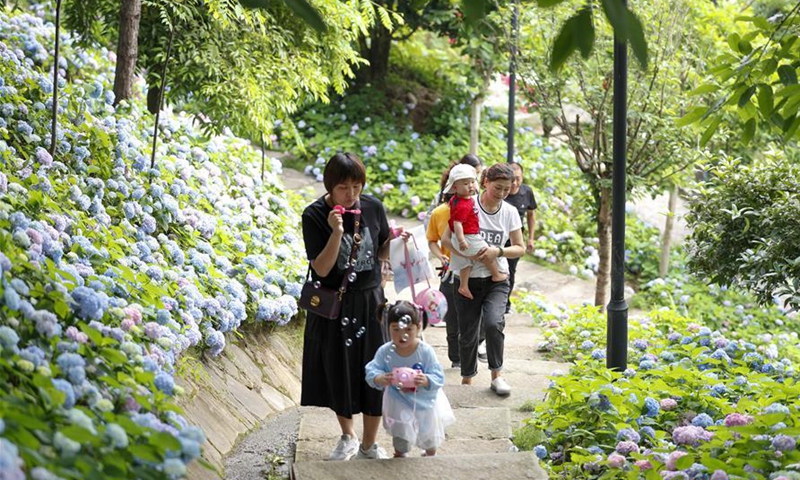 People enjoy hydrangea flowers at Hanfeng Lake National Wetland Park in Kaizhou District of Chongqing, southwest China, May 22, 2020. (Photo by Huang Wei/Xinhua)