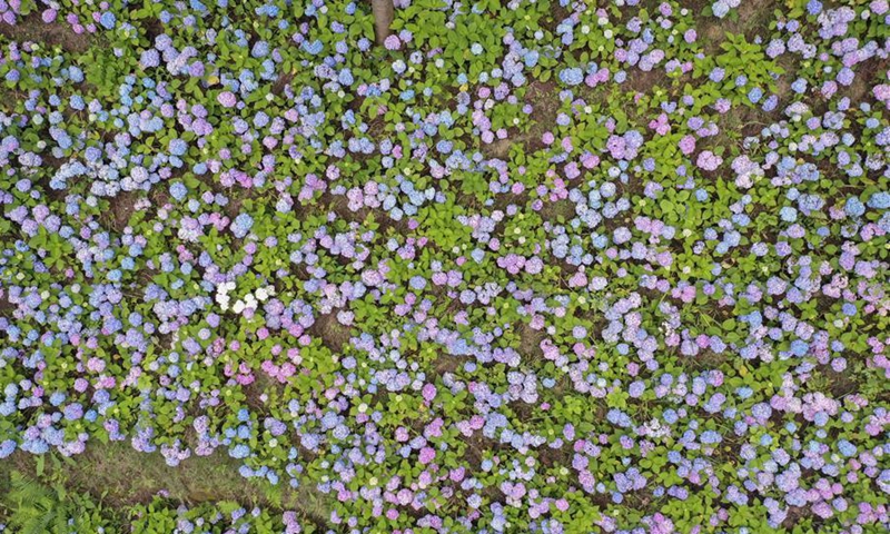 Aerial photo taken on May 22, 2020 shows hydrangea flowers at Hanfeng Lake National Wetland Park in Kaizhou District of Chongqing, southwest China. (Photo by Huang Wei/Xinhua)