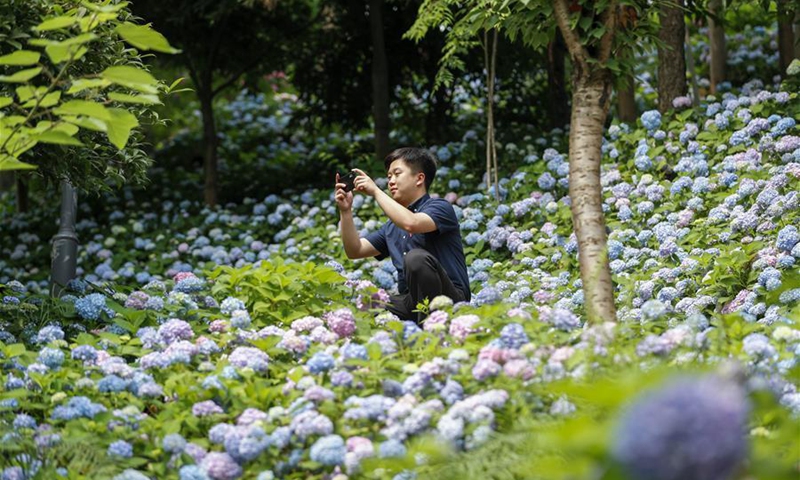 A man takes photos of hydrangea flowers at Hanfeng Lake National Wetland Park in Kaizhou District of Chongqing, southwest China, May 22, 2020. (Photo by Huang Wei/Xinhua)
