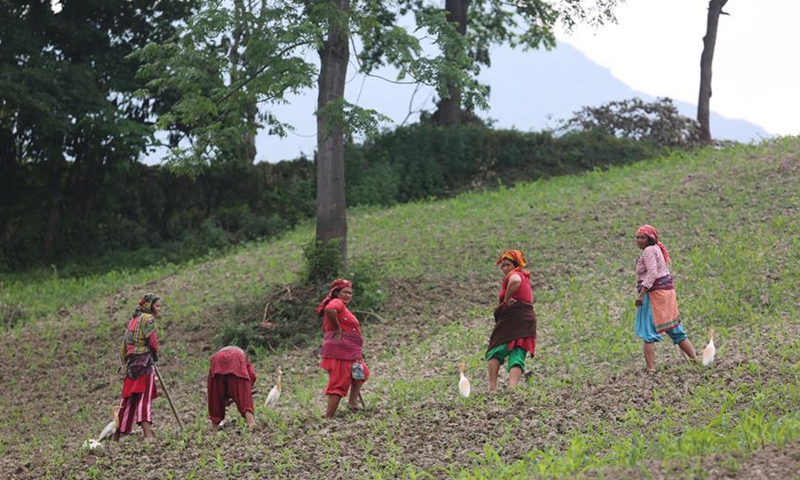 Women work on a corn field in Kathmandu, Nepal, May 23, 2020. (Xinhua/Zhou Shengping)