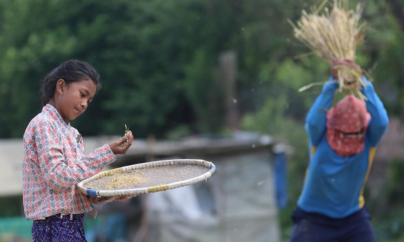 A girl works on a wheat field in Kathmandu, Nepal, May 23, 2020. (Xinhua/Zhou Shengping)