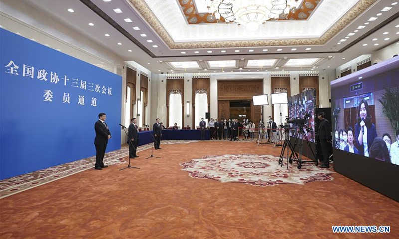 Members of the 13th National Committee of the Chinese People's Political Consultative Conference (CPPCC) are interviewed via video link ahead of the second plenary meeting of the third session of the 13th CPPCC National Committee at the Great Hall of the People in Beijing, capital of China, May 24, 2020. (Xinhua/Liu Jinhai)