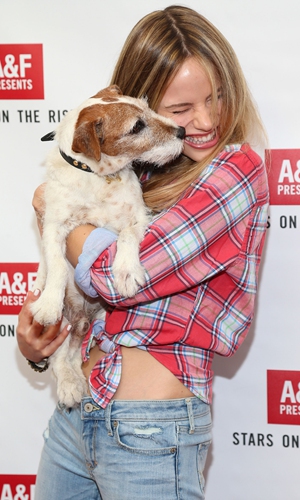 Actress Halston Sage and canine actor Uggie attend Abercrombie & Fitch's presentation of their 2013 Stars on the Rise at The Grove on July 11, 2013 in Los Angeles, California. Photo: AFP