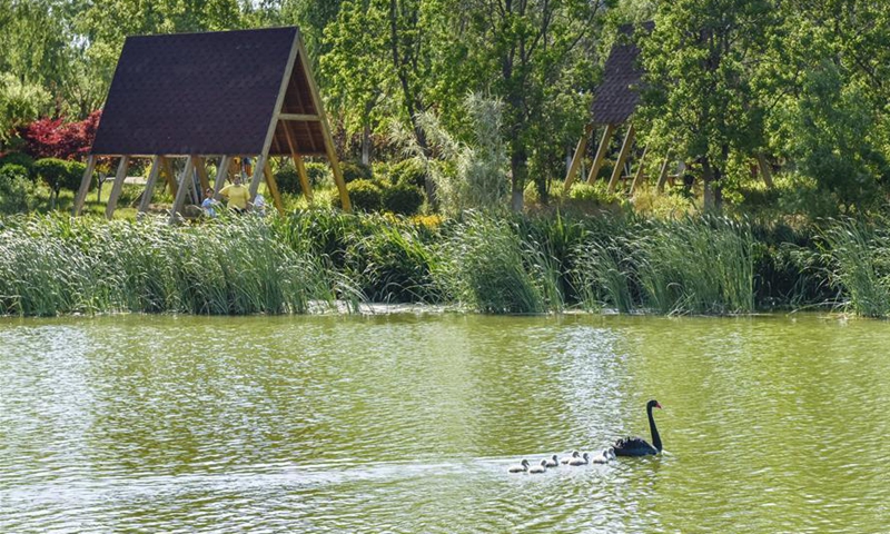 Swans are seen at Qingquan park transformed from a coal mining area in Fengfeng Mining Area in Handan, north China's Hebei Province, May 23, 2020. Fengfeng Mining Area used to be an old mining area with a history of 100 years, thriving and developing by its coal resource. In recent years, the area is putting the pedal to the metal to restore its environment and promote all-for-one tourism. Up to now, the area has restored environment of 90 mines. (Xinhua/Mu Yu)