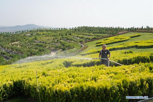 A staff member waters bushes at a forest park transformed from a coal mining area in Fengfeng Mining Area in Handan, north China's Hebei Province, May 23, 2020. Fengfeng Mining Area used to be an old mining area with a history of 100 years, thriving and developing by its coal resource. In recent years, the area is putting the pedal to the metal to restore its environment and promote all-for-one tourism. Up to now, the area has restored environment of 90 mines. (Xinhua/Mu Yu)