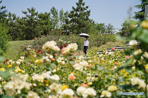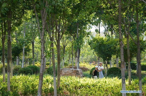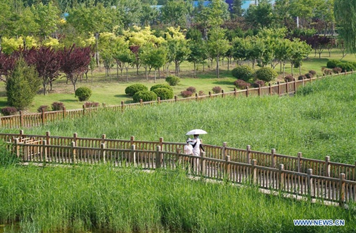 Tourists take a walk at Qingquan park transformed from a coal mining area in Fengfeng Mining Area in Handan, north China's Hebei Province, May 23, 2020. Fengfeng Mining Area used to be an old mining area with a history of 100 years, thriving and developing by its coal resource. In recent years, the area is putting the pedal to the metal to restore its environment and promote all-for-one tourism. Up to now, the area has restored environment of 90 mines. (Xinhua/Mu Yu)