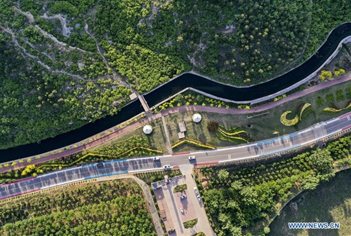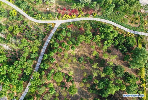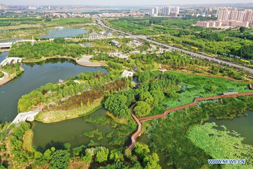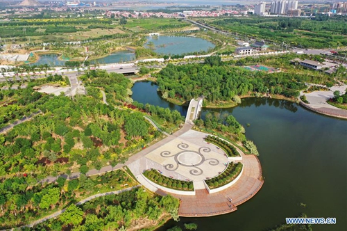Aerial photo taken on May 23, 2020 shows a view of Qingquan park transformed from a coal mining area in Fengfeng Mining Area in Handan, north China's Hebei Province. Fengfeng Mining Area used to be an old mining area with a history of 100 years, thriving and developing by its coal resource. In recent years, the area is putting the pedal to the metal to restore its environment and promote all-for-one tourism. Up to now, the area has restored environment of 90 mines. (Xinhua/Mu Yu)