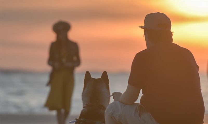 A man watches sunset with a dog by the Adriatic Sea in Zadar, Croatia, May 24, 2020. (Dino Stanin/Pixsell via Xinhua)