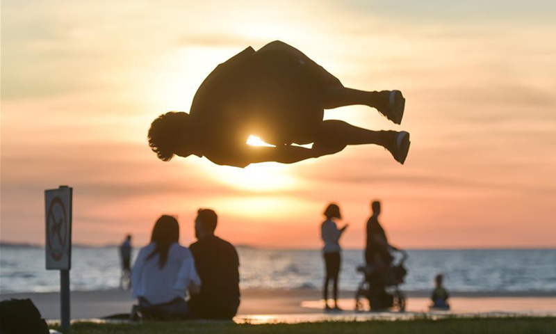 A man performs acrobatics by the Adriatic Sea at sunset in Zadar, Croatia, May 24, 2020. (Dino Stanin/Pixsell via Xinhua)
