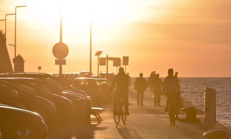 People enjoy the view of sunset by the Adriatic Sea in Zadar, Croatia, May 24, 2020. (Dino Stanin/Pixsell via Xinhua)