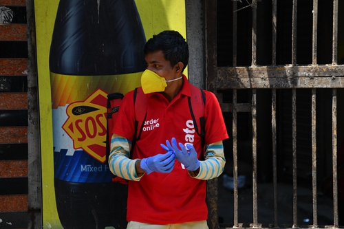 A food delivery worker for online app Zomato dons gloves during a government-imposed nationwide lockdown on Sunday as preventative measures were launched against the COVID-19 coronavirus in Mumbai. Photo: AFP