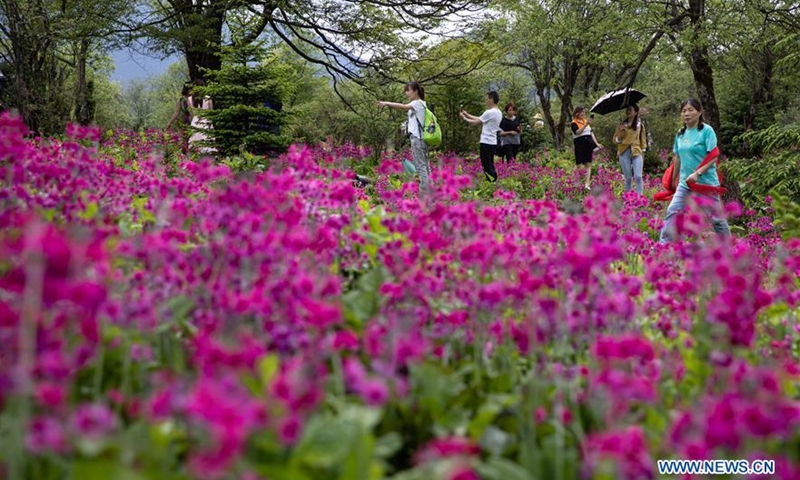 Visitors view primulas in Hanyuan County, southwest China's Sichuan Province, May 24, 2020. Wild primulas usually grow by rivers or at moist areas 2,000 to 2,500 meters above sea level.Photo:Xinhua