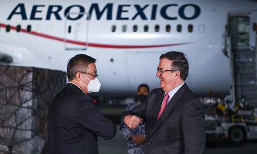 China's Ambassador to Mexico Zhu Qingqiao (L) greets Mexican Foreign Minister Marcelo Ebrard with elbow bumps during a welcome ceremony for a flight from China with medical supplies at an international airport in Mexico City, Mexico, on May 12, 2020. A flight from Shanghai to Mexico City arrived late Tuesday, marking the completion of the first phase of a China-Mexico initiative to combat the novel coronavirus (COVID-19) pandemic, top officials said on Wednesday. Since launching the massive air bridge between the two countries in April, ten flights have brought about 120 tons of medical equipment acquired by Mexico's government from a Chinese firm. (Xinhua/Xin Yuewei)