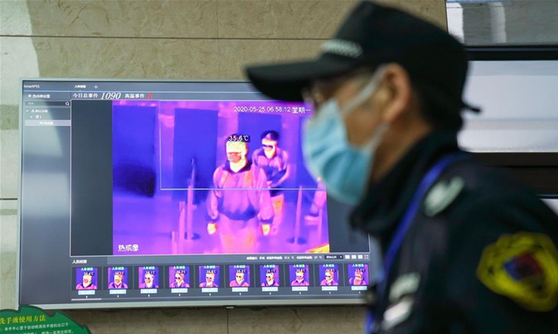 A security staff member is on duty near a temperature detector at an entrance of the teaching building in Heilongjiang Experimental High School in Harbin, northeast China's Heilongjiang Province, May 25, 2020. Students in their final year of high school in Heilongjiang returned to campus on Monday. (Xinhua/Wang Song)