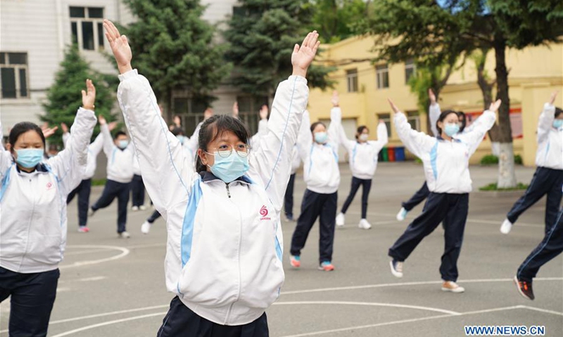 Senior students attend outdoor activities in Heilongjiang Experimental High School in Harbin, northeast China's Heilongjiang Province, May 25, 2020. Students in their final year of high school in Heilongjiang returned to campus on Monday. (Xinhua/Wang Song)