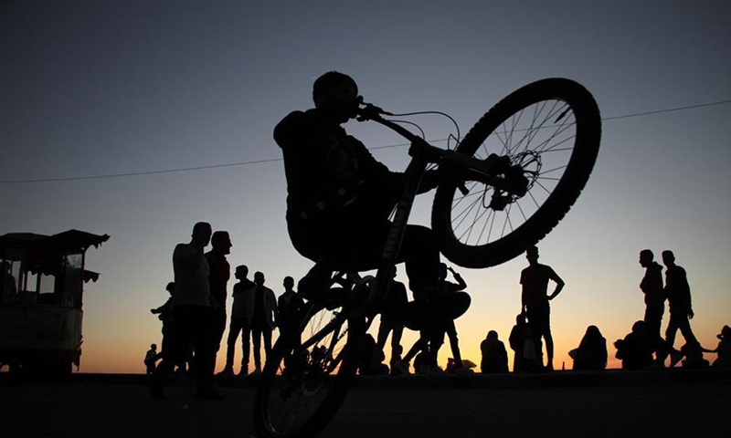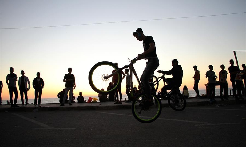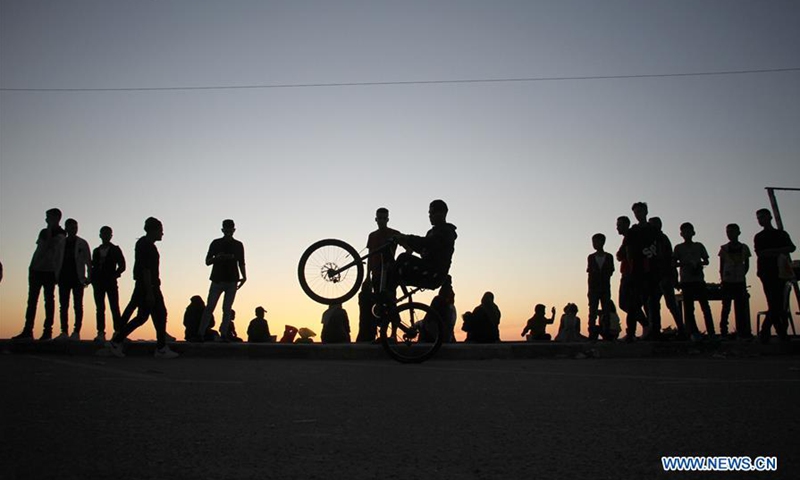 Palestinians enjoy their time during sunset on a beach in Gaza City, on May 25, 2020. (Photo by Rizek Abdeljawad/Xinhua)